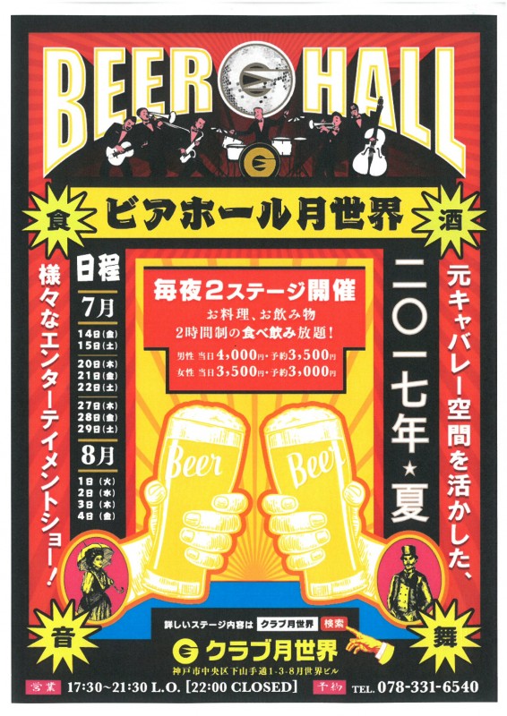 | 時 間 | 営業時間 17:30~22:00 (L.O 21:30) ※2時間制のビアホールのショータイムライブです 1回目 19:15~ / 2回目 20:30~ (各25分ステージ) |