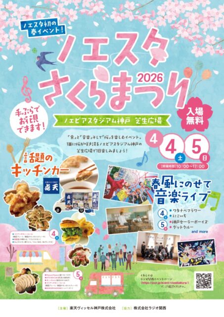| 詳 細 | ノエビアスタジアム神戸にて開催される、ノエスタさくらまつりに出演させていただきます! ※雨天決行、荒天中止 |